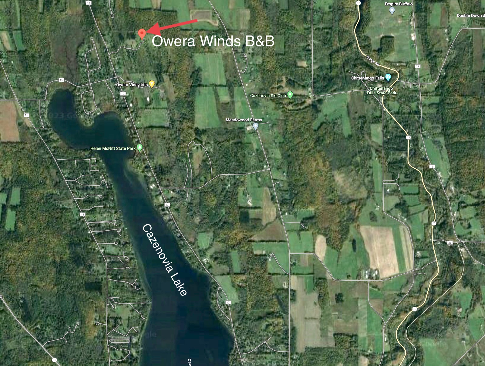 Nestled in the hills above Cazenovia Lake, Owera Winds Bed and Breakfast offers a comfortable and secluded retreat, yet is minutes from fine and casual dining, microbreweries, shopping, a winery and one of the tallest waterfalls in New York State.