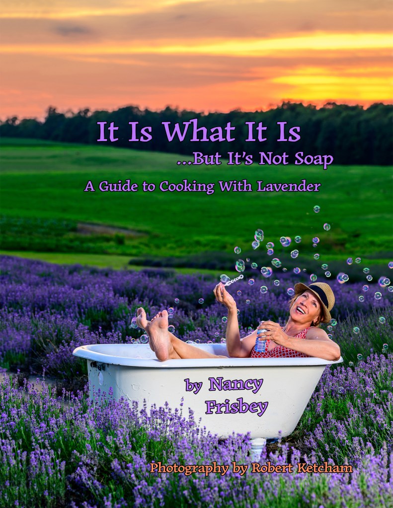 “It Is What It Is….But It’s Not Soap; A Guide To Cooking With Lavender” by cookbook author Nancy Frisbey is a delightful book for anyone interested in adding culinary lavender to their table. Beautifully illustrated with many photographs, the recipes are the perfect introduction to cooking with lavender for anyone, from beginner to well seasoned chef.
